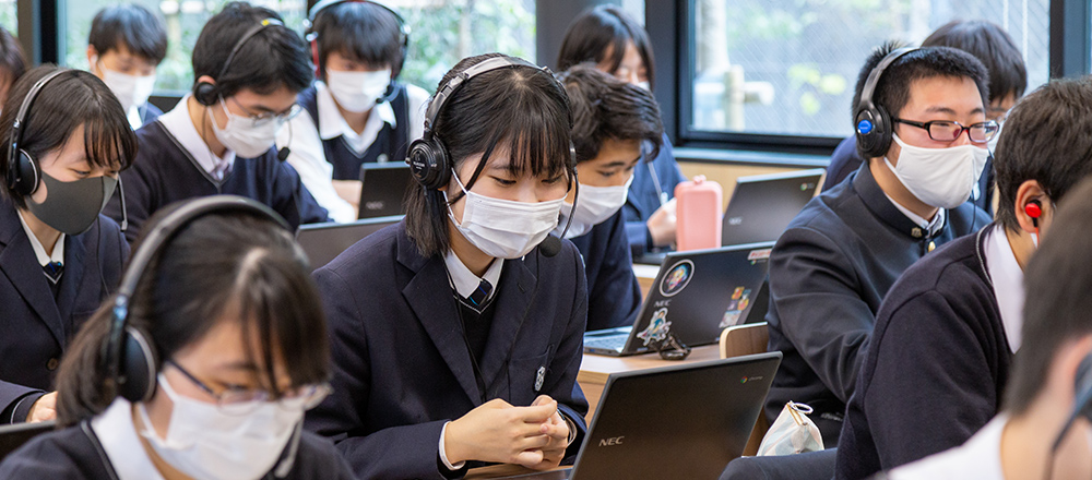 ICT端末を使った2つの特徴的な授業を見学させてもらった。1つ目は、高校の英語で年10回以上取り入れているオンライン英会話。2018年度より「学研オンライン英会話 for School」を使い、生徒が外国人講師と1対1で25分間会話する。導入当時は、英語教育改革や実際には導入が見送られた英語の民間試験の対策ではあったが、新学習指導要領で必要な思考力・判断力・表現力を養えるということで、現在もオンライン英会話を続けている。その理由について佐々木繁教諭は「言葉は道具なので、相手の言うことを理解し、自分が思っていることを伝えたいと思うことで、英語をもっと学びたいという欲求につながる効果があると思います」と話す。英作文の成績が学年で上がるなどの結果を見て、オンライン英会話で表現力が鍛えられたことによる効果のひとつではないかと感じているという。