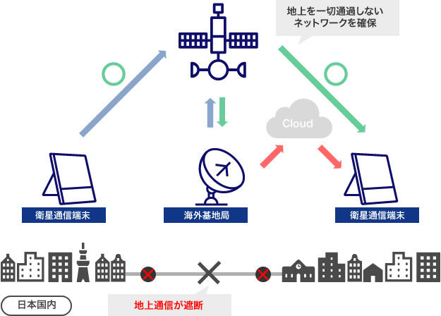 国内の地上インフラ設備を利用しないため、災害時でも地上の通信設備故障の影響を受けることなく、『安心・確実』な通信手段を確保できます。